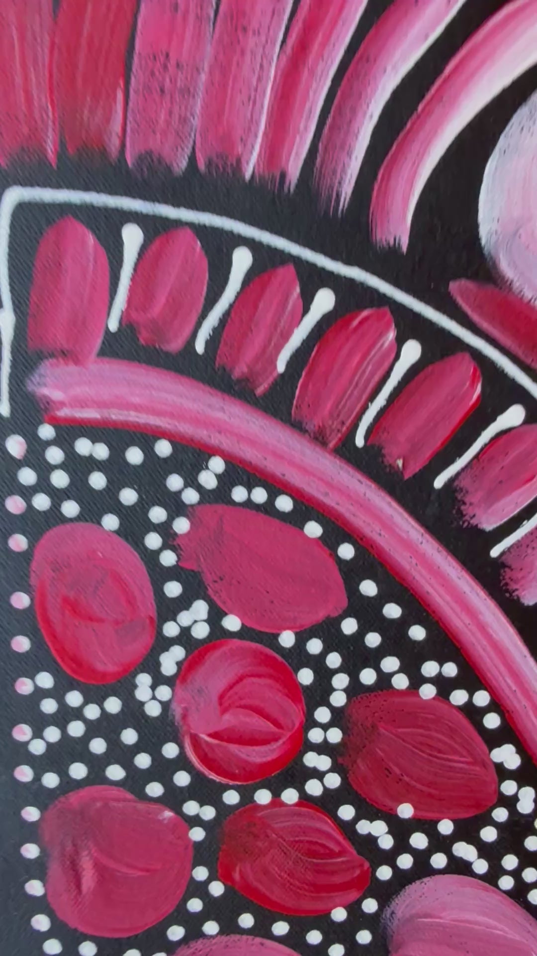 One of a kind unique creationsThe red and white palette in this Dreamtime painting by Louise Numina Napananka is so engrossing. The mixture of colours gives the palette a range of tones, from raspberry to strawberry clouds, from sauvignon to merlot. It's a fantastic piece of Aboriginal Art!